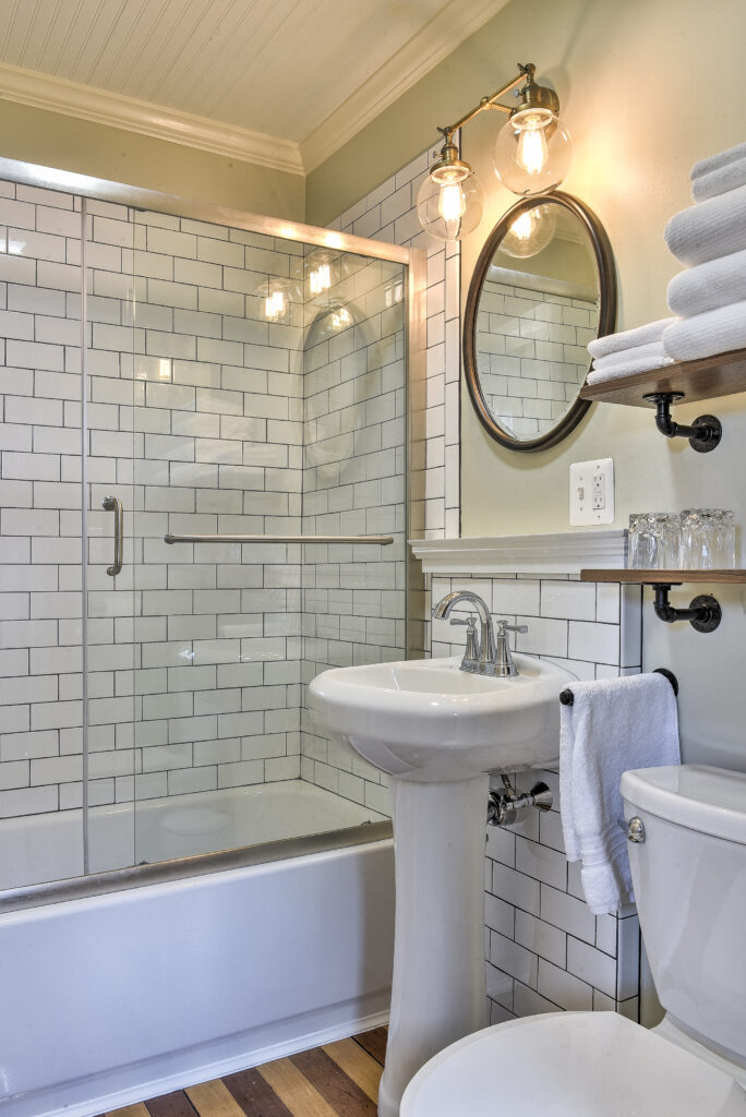 Each of the guest rooms at the Burrell House Inn offer private gleaming full bathrooms complete with fine cotton bath towels and all natural eco-friendly bathing products. The Birch room full shower also has a bathtub